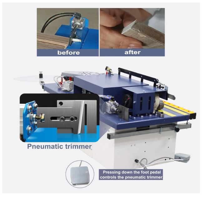 - Doble función versátil – Enchapado y corte automático para cantos rectos (ideal para producción en serie) + corte manual con pedal neumático para cantos curvos y formas complejas.